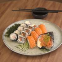 5 Hossomaki Camarão, 5 Uramaki Salmão, 1 porção de Niguiri Salmão (4 peças), e 1 Temaki Salmão.