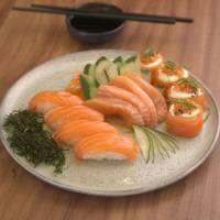 1 porção de Gunkan Salmão, 1 porção de Niguiri Salmão, 1 porção de Sashimi Salmão. Cada porção contém 4 unidades.